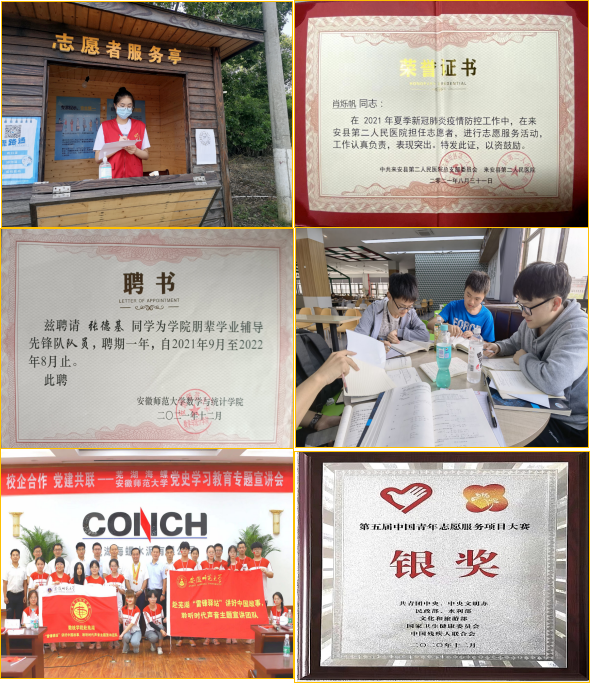 组织团员利用暑期、节假日等深入社区、学校、企业等开展爱心支教、阳光助残、抗疫抗洪等志愿服务活动,团支部成员志愿者注册率达100%,累计志愿服务时长已达2000余小时,团支部成员参与的8支团队获评暑期社会实践校级优秀团队,多人获评优秀个人;助力“蜜糖π递”阳光助残项目,以“三数”工作理念,建构“四多”服务体系,开发帮助唐氏综合征儿童构建生活世界认知模型,获省志愿服务项目大赛金奖、国赛银奖。