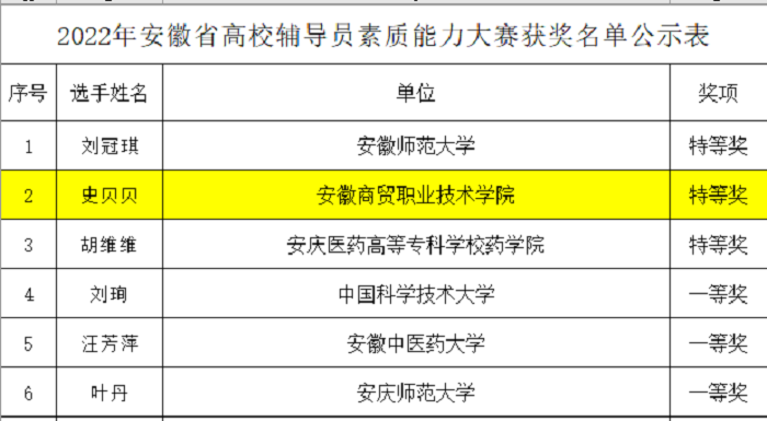 4月29日至30日,安徽省2022年高校辅导员素质能力大赛省级决赛于线上举行,信息与人工智能学院史贝贝老师与来自全省本科高职院校共90名选手同场竞技,最终凭借其扎实的理论素养和优秀的业务能力,以全省高校总分并列第一名的成绩荣获大赛特等奖。
