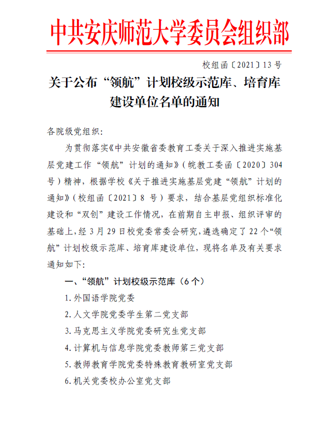 4月7日,学校公布 “领航”计划校级示范库、培育库建设单位名单,校办公室党支部成功入选校级示范库。这是校办党支部自2019年12月被教育部评为“全国党建工作样板支部”和2020年6月通过“全国党建工作样板支部”中期考核后再次入选示范库。