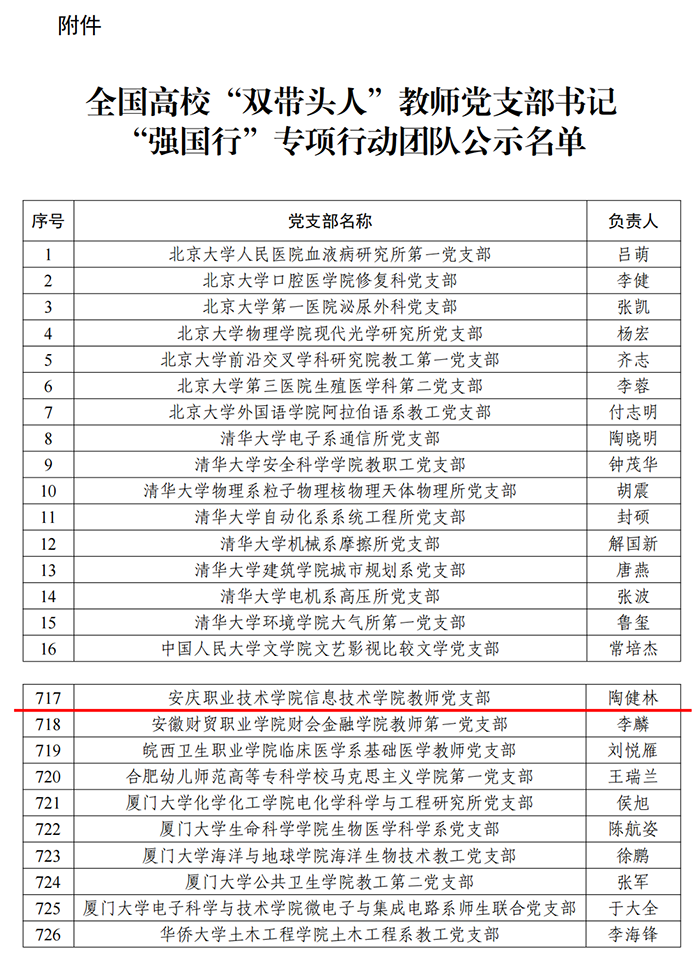 9月19日,教育部发布了《关于全国高校“双带头人”教师党支部书记“强国行”专项行动团队名单的公示》名单,我校信息技术学院教师党支部入选全国高校“双带头人”教师党支部书记“强国行”专项行动团队。这是我校信息技术学院教师党支部继入选第四批“全国党建工作样板支部”培育创建单位以来的又一重大建设成果。
