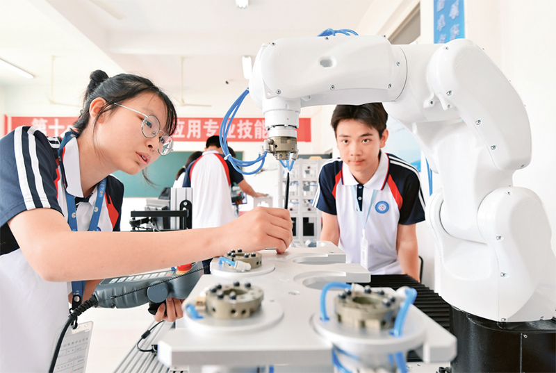 加快实现高水平科技自立自强、建设科技强国和人才强国,需要培养好使用好大批青年科技人才。图为2024年5月29日,在河北省石家庄市平山县职业教育中心工业机器人实训室,学生进行工业机器人操作实训。 人民图片 张晓峰/摄
