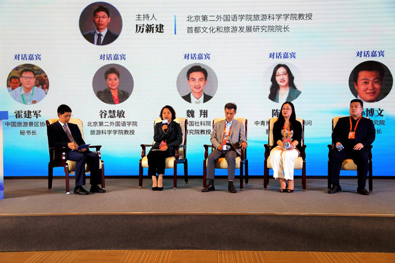 圆桌论坛环节由北京第二外国语学院旅游科学学院教授、文化和旅游部文化和旅游研究基地(北二外)主任、北京旅游发展研究基地首席专家厉新建主持。北京第二外国语学院旅游科学学院教授谷慧敏、中国旅游景区协会秘书长霍建军、中国社科院财经战略研究院研究员魏翔、中青博联整合营销顾问公司副总经理陈妍、携程研究院执行院长孙博文等共同围绕“疫后中国文旅产业复苏与可持续发展”开展深入对话。