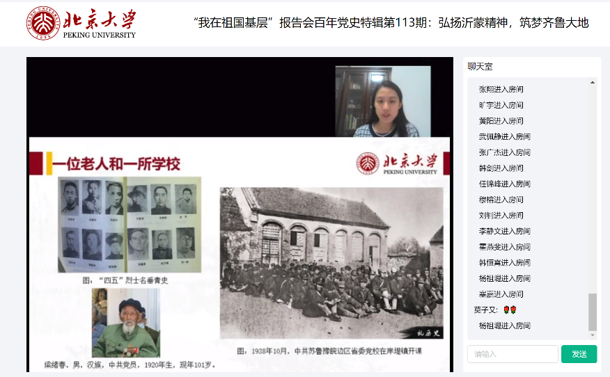 黑龙江选调生李超和吉林选调生韩剑不约而同地分享了东北抗联的故事,白山黑水,忠烈英魂,“抗联精神”始终激励着北大选调生们扎根东北大地,为这里的人民贡献青春力量。他们表示,“在基层能够听到最亲切的声音、看到最真实的故事、体会最深刻的感受、收获最宝贵的人生经验,这里已然成为自己的故乡和永恒的精神家园”;湖北选调生马刚讲述了当地广为流传的刘华清将军的事迹,他从这些故事中汲取力量,誓做承前启后的接棒人。