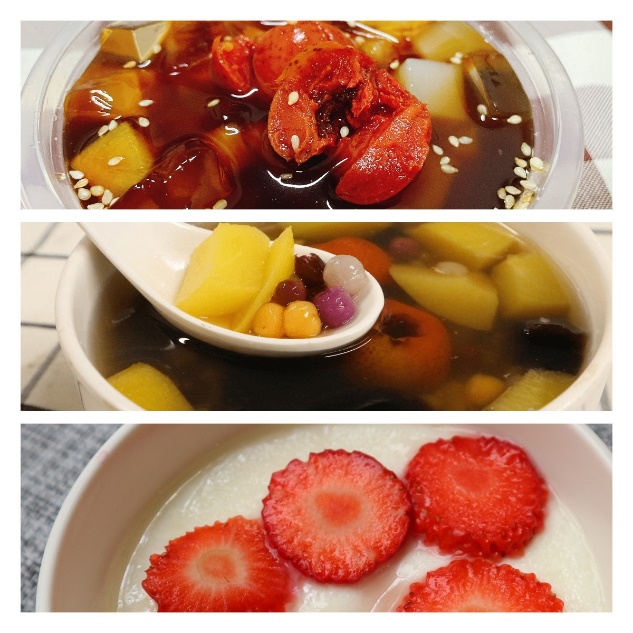 冰鲜甜品系列(上:学一水果冰粉;中:家园四果汤;下:农园草莓双撞奶)