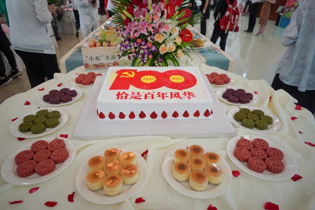 长0.6米、宽0.4米庆祝建党百年华诞的蛋糕引来师生驻足,大家纷纷围观。
