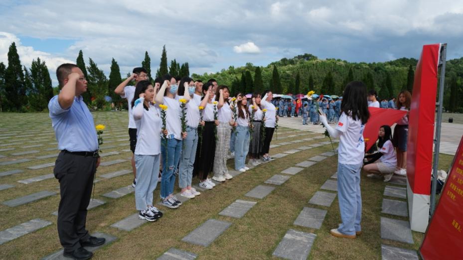 随后,课程团队来到湘江战役英魂凭吊广场,怀着沉重与敬畏的心情,同学们在广场上为牺牲的革命先烈默哀、敬献花篮并三鞠躬。在刻有英雄形象与姓名的纪念广场上,同学们重温入团誓词。重温入团誓词仪式由史诗主持。仪式中,同学们为英魂默哀三分钟,并在领誓人杨双庆同学的带领下郑重进行入团宣誓,在“红军魂”雕塑前,面对鲜红的党旗、团旗,同学们铿锵有力、满怀激情的宣誓回响在纪念广场。烈日炎炎,同学们斗志昂扬,精神振奋。重温入团誓词仪式让同学们倍受鼓舞,更加明确自己作为共产主义接班人应有的责任与义务,进一步坚定赓续革命精神血脉和砥砺前行的信念决心。
