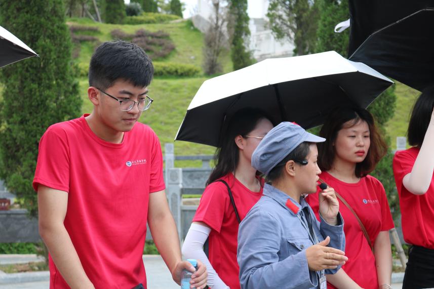 距离下立湾屯北约一公里处,有一口特殊的井,标记着一段壮烈的英雄史诗。井口宽约2米,上大下小,形状似酒坛,也因此被称作酒海井。上午11时许,同学们来到酒海井红军纪念园,深入了解相关历史,瞻仰先烈。同学们首先肃立在墓冢前行三鞠躬礼,向烈士纪念碑集体默哀并献上花束,以此祭奠缅怀红军烈士。随后,同学们跟随讲解员来到井边,了解那一段用生命与血泪所保存的史实。新圩阻击战中,红五师撤防时迫于紧急的战争形势,来不及将救护所内的100多名中重症伤员转移,被敌人发现后残忍地丢进井内,壮烈牺牲。2017年灌阳县正式启动了酒海井红军烈士遗骸的勘探打捞工作,由于井内地质复杂、淤泥阻塞,经过近两个月的抽水、打捞、清理工作,大量人体遗骸成功清出,种种科学证据都将遗骸指向84年前的红军伤员。同学们站在井边,热泪盈眶,垂头陷入哀思,表达对红军烈士的无限敬仰与缅怀。跟随讲解员的引导,同学们接下来进入酒海井纪念馆中,浏览声光等电子复原技术、图片文字记录、革命物件展示等,聆听“半床棉被”“祖孙三代保红旗”等历史故事,更加完整地了解艰难曲折的革命过程,更加全面理解了党和人民群众血肉联系的内涵。