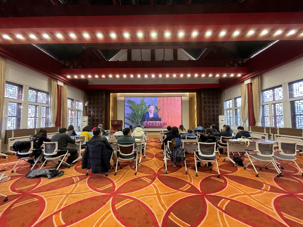 11月24日下午,开班仪式及首场培训在高等教育出版社报告厅举行,采用“主会场+分会场”“线上+线下”“直播+回放”的方式进行。北京大学设置多个视频分会场,各院系教学管理负责人及教师代表、教学管理人员代表等60余人在哲学楼101大教室集体观看了开班式的直播,并共同参加了首场培训。国际关系学院、外国语学院、经济学院、体育教研部等单位也组织教师在各自学院集体观看了开班式和培训的直播。