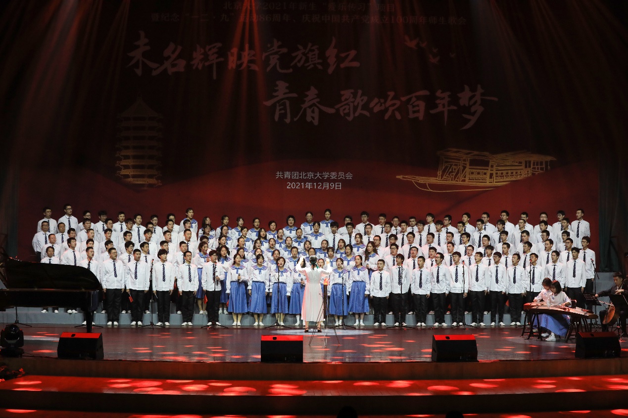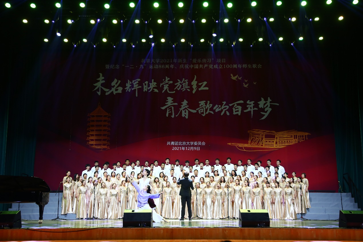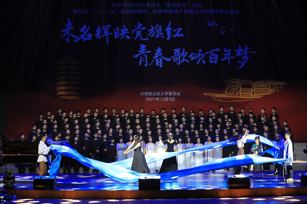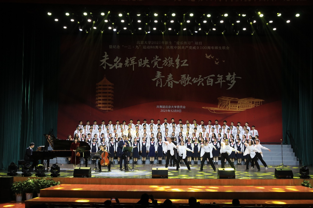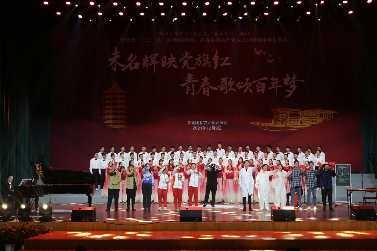 北京大学连续多年举办“一二·九”师生歌会,数十年间引领北大青年在歌声中追思峥嵘岁月,在传习中思考时代主题,将爱国主义教育和集体主义教育融入到声乐美育教育中,年复一年,重温革命先辈为实现民族独立和解放而奋勇前进的革命历程,赓续“团结起来,振兴中华”和“请党放心,强国有我”的青年使命。本届纪念“一二·九”运动86周年、庆祝中国共产党成立100周年师生歌会的主题是“未名辉映党旗红,青春歌颂百年梦”,由28个院系师生组成的22支代表队经历了两个多月的集体排练,倾情演绎,呈现出较高的艺术水准。