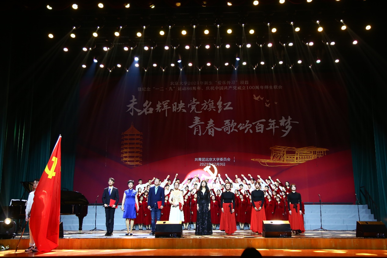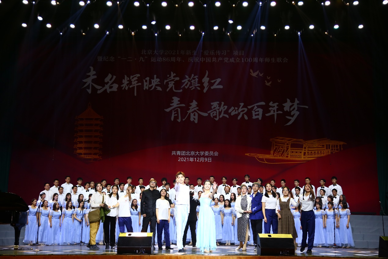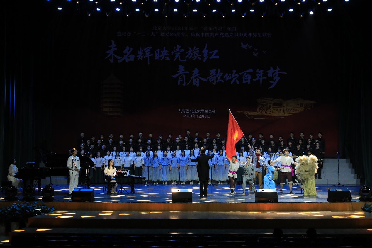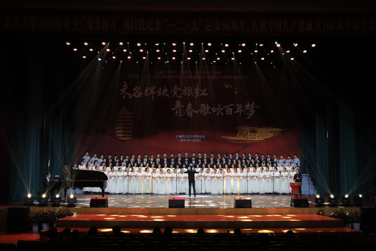 北京大学连续多年举办“一二·九”师生歌会,数十年间引领北大青年在歌声中追思峥嵘岁月,在传习中思考时代主题,将爱国主义教育和集体主义教育融入到声乐美育教育中,年复一年,重温革命先辈为实现民族独立和解放而奋勇前进的革命历程,赓续“团结起来,振兴中华”和“请党放心,强国有我”的青年使命。本届纪念“一二·九”运动86周年、庆祝中国共产党成立100周年师生歌会的主题是“未名辉映党旗红,青春歌颂百年梦”,由28个院系师生组成的22支代表队经历了两个多月的集体排练,倾情演绎,呈现出较高的艺术水准。