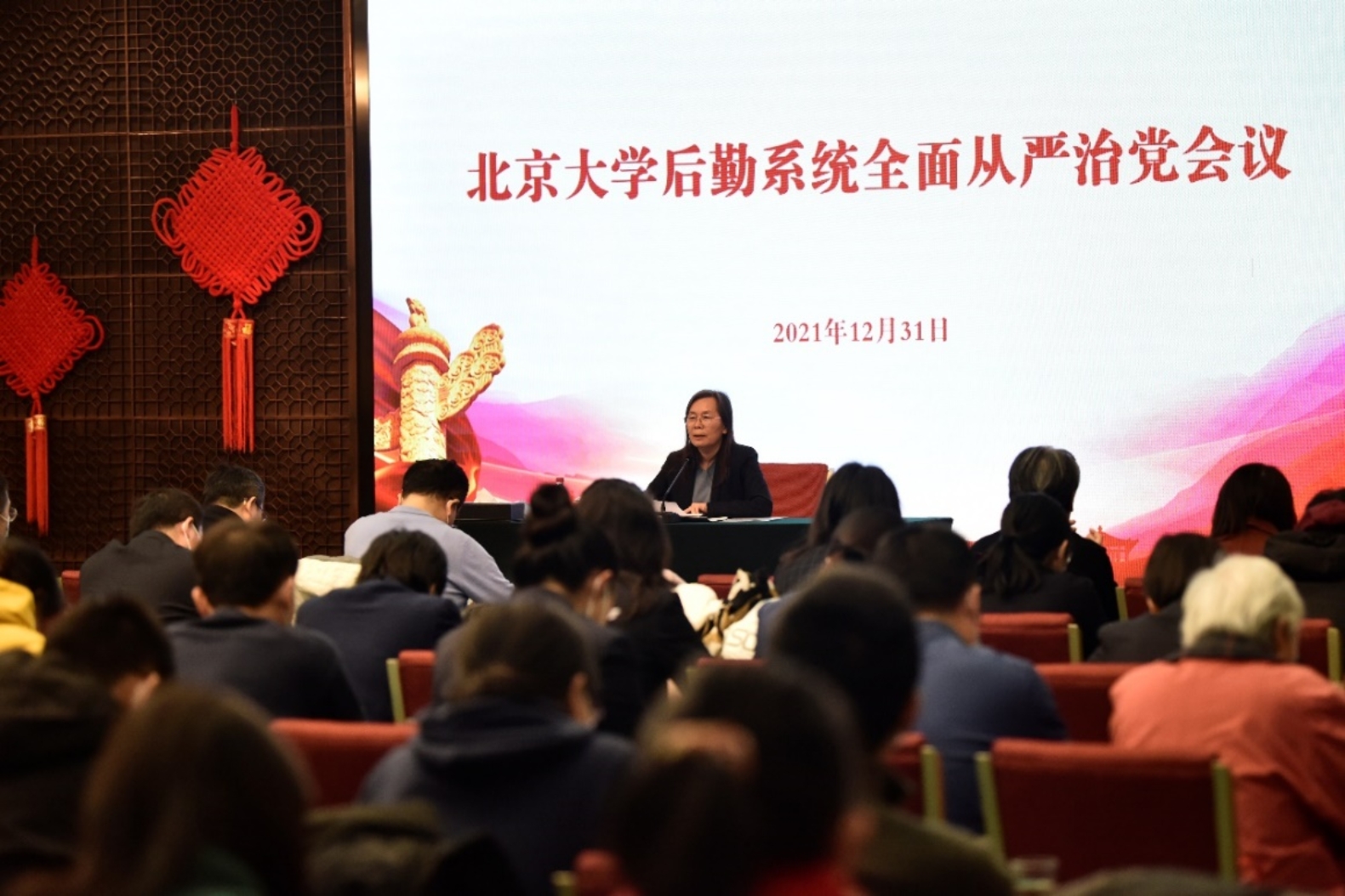 2021年12月31日上午,北京大学后勤系统全面从严治党会议在勺园七号楼弘雅厅举行。学校党委副书记、纪委书记叶静漪出席会议,并结合深化中央巡视整改和学校党委巡察整改,以“发挥全面从严治党政治引领和政治保障作用,增强纪法意识,健全廉政风险防控体系”为题作专题报告。后勤系统各单位党政主要负责同志,后勤党委委员、纪委委员,后勤工会、团委负责同志,各党总支、各支部书记、纪检委员以及后勤各单位廉政风险防控重点岗位负责同志等110余人参加会议。会议由后勤党委书记胡新龙主持。