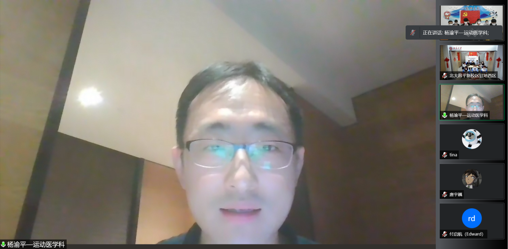 杨渝平的讲述让同学们对北大冬奥医疗保障团队精湛的医术赞叹不已,同时被医者仁心和北大医学的厚道精神所深深感动。在交流互动环节中,国家游泳中心语言服务领域志愿者、北京大学外国语学院杜姝格向他提问参加冬奥医疗保障工作的初心。杨渝平表示,崇礼院区工作压力大,作为医疗保障领导团队中最年轻的医生,他主动请缨进入闭环,将医疗工作整体进行了梳理,希望能够凭借自己在运动医学领域工作23年的丰富临床经验为北京冬奥会保驾护航。