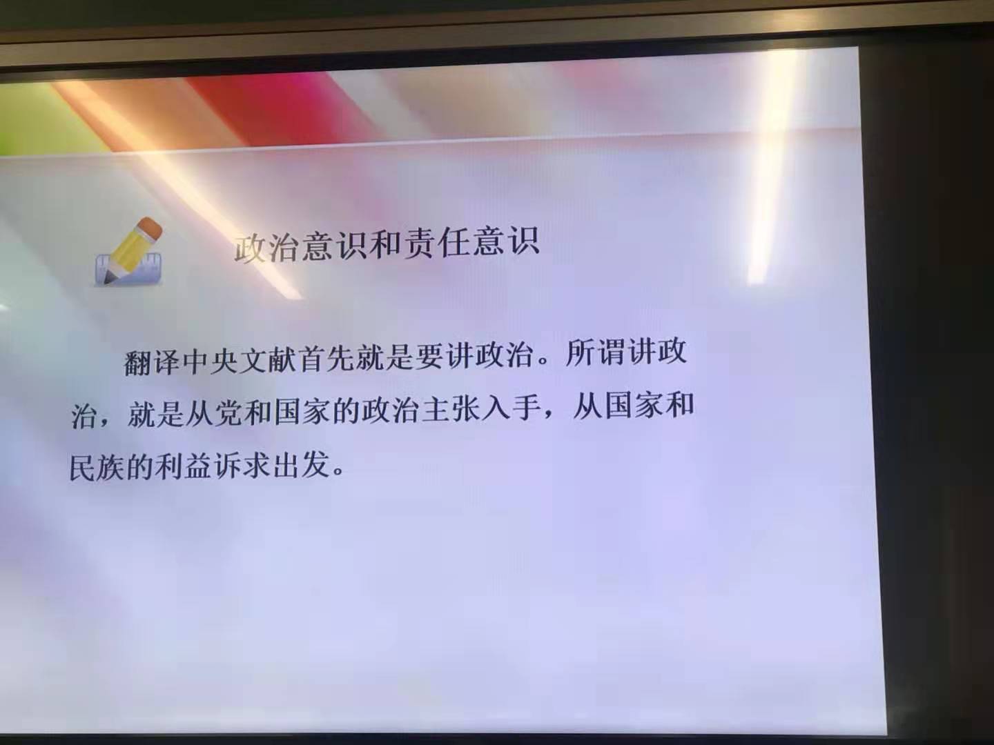 首先是要明确政治意识和责任意识。翻译中央文献首先就是要讲政治,要从党和国家的政治主张入手,从国家和民族的利益诉求出发。在翻译过程中要紧绷这根弦,要具有足够的政治素养,关注时事,了解政治,学习理解相关政策,储备足够的政治知识,绝不能犯政治错误。霍娜特别提醒同学们要注意政治考量,在自己的积累尚且不足的时候,遇到拿捏不准的问题,要学会到特定的地方找到有关的知识,了解相关情况。