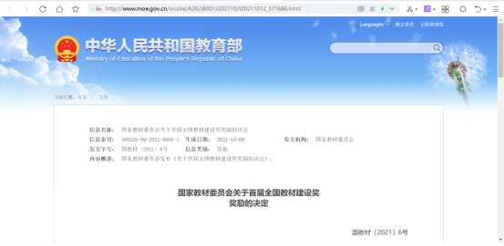 全国教材建设奖由国家教材委员会主办,教育部承办,每四年评选一次,对各级各类优秀教材和做出突出贡献的先进集体、先进个人予以表彰,是新中国成立以来首次设立全面覆盖教材建设各领域的专门奖励项目,也是全国教材建设领域的最高奖。2020年10月,国家教材委员会启动首届全国教材建设奖评选工作。
