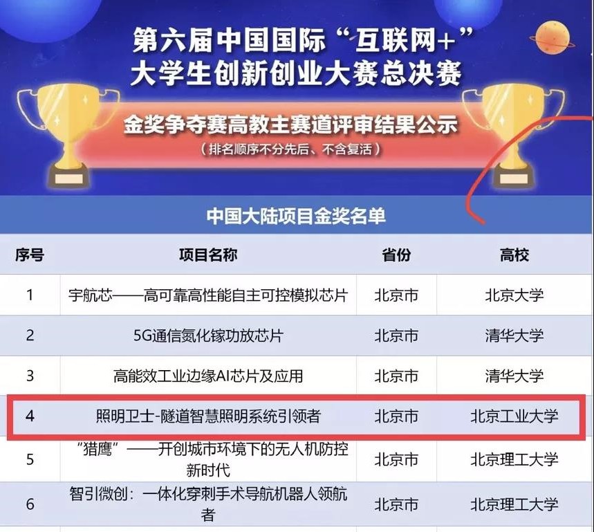 11月18日,第六届中国国际“互联网+”大学生创新创业大赛总决赛在广东省广州市华南理工大学举行。经过激烈的角逐,北京工业大学的“照明卫士-隧道智慧照明系统引领者”项目,突出重围,勇夺金奖,这是我校首次荣获互联网+国赛金奖,实现了北京市属高校金奖零的突破。