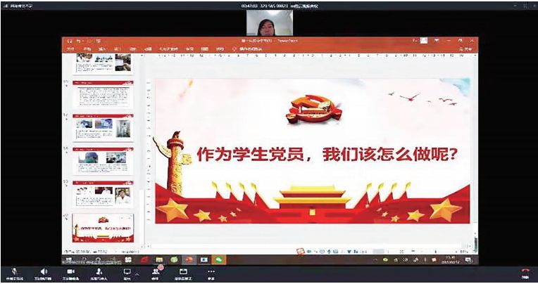 与此同时,在第一学习小组的线上课堂,学生党员们正在认真聆听楼雨杼同学分享自己参与社区防疫工作的经历:“1月底的时候,为有效阻断疫情传播,我参与了社区党支部‘封村封路’的相关工作……”