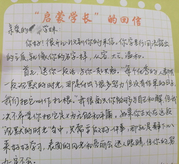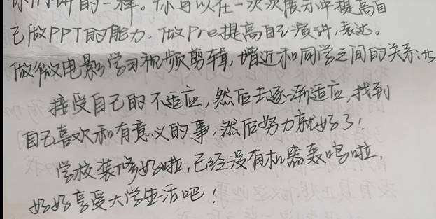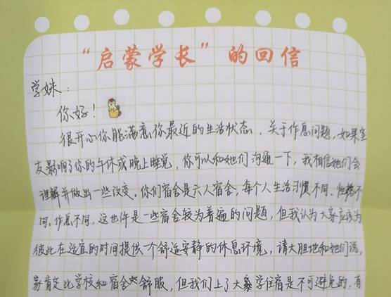 除了通过书信交流,启蒙学长们还到新生宿舍和宿舍面对面交流,用一封信开启了一段有着不同经历、阅历但拥有同样真心的启蒙学长与新生的友谊。