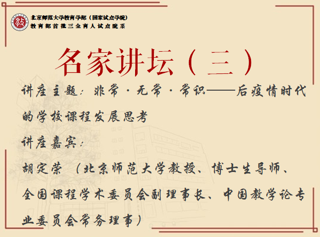 2020年4月30日15:00-17:00,北京师范大学教育学部第十一届学术文化节名家讲坛第三场“非常·无常·常识——后疫情时代的学校课程发展思考”主题讲座成功举办,主讲嘉宾为北京师范大学教授、博士生导师、全国课程学术委员会副理事长、中国教学论专业委员会常务理事胡定荣老师,讲座以线上直播的形式进行,参与人数达到300余人。