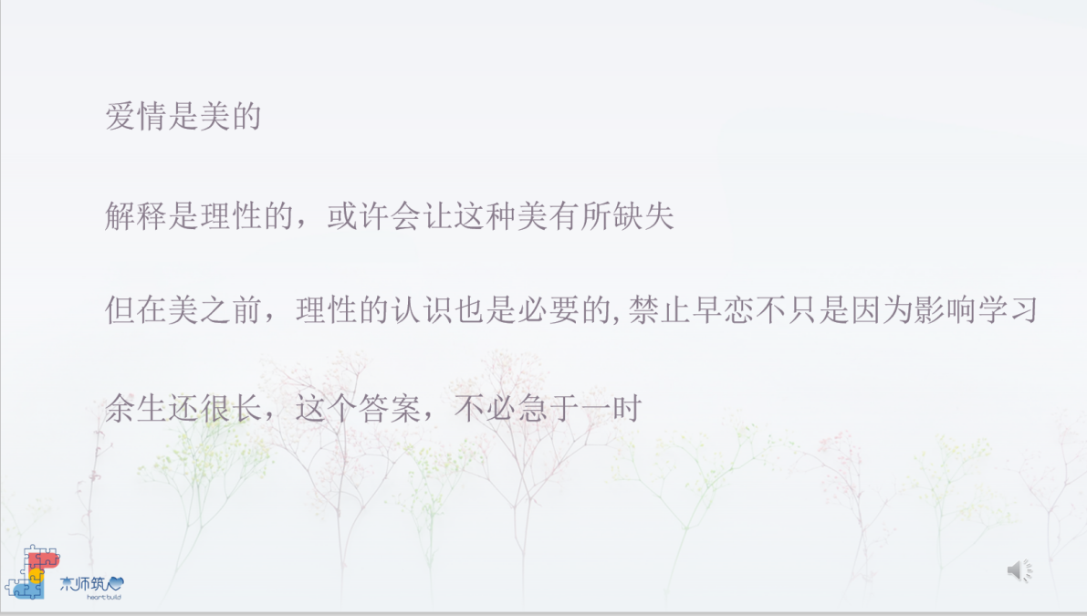 我录的这节课其实在去年支教的时候讲过。感觉当时大家还是很感兴趣的,毕竟对中学生来说,可能很少会有老师将爱情正式地作为一节课来讲。但其实即使是学生也应该对爱情这种亲密关系有清晰的认识,也希望自己的这节课可以给听的同学们带来收获。就我个人而言,还是第一次以录课的形式去讲一节课,感觉很有趣,如果以后还有机会的话,也会更多尝试一下。