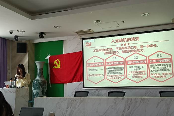 全体起立,奏唱《国际歌》后,张哲源、王薇等18名入党积极分子便依次开始了他们的预答辩。每人答辩过后,在场的党员和预备党员针对其简历、PPT、讲述内容等方面提出了具体的改进建议。