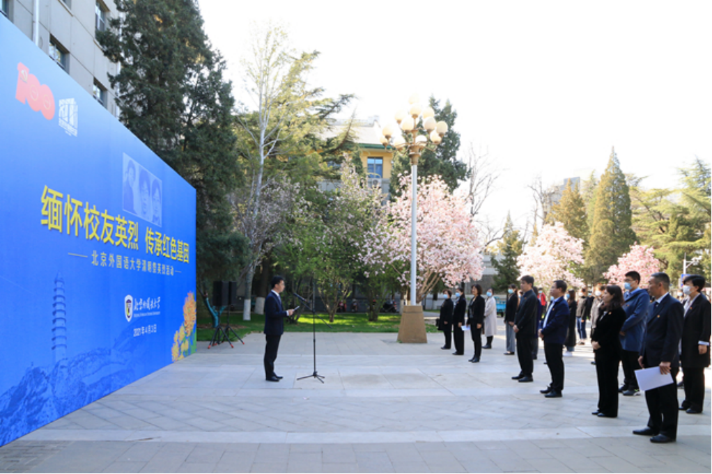 清明祭英烈,共铸中华魂,4月3日,北京外国语大学举办清明祭英烈活动,缅怀校友英烈,传承红色基因。党委副书记苏大鹏,党委常委、副校长赵刚以及师生代表60余人深切缅怀在我国驻南联盟使馆被炸事件中英勇牺牲的北外校友邵云环、许杏虎和朱颖三位烈士。活动由苏大鹏主持。