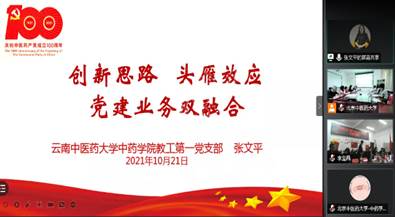 随后中药学院团委书记周天老师以学生党建联合会的组建为例,进行党建工作的经验分享。学生党建联合会联合各支部,将党建与学术发展相结合,支部融合,统筹协调,资源共享,改变了各支部唱“独角戏”的现象。学生党建联合会下设“三红”工程:“红·阅”读书项目工程、“红·印”实践项目工程、“红·颂”剧目展演项目工程。通过三项工程,将党建工作融入学生日常生活,将政治理论与实践结合,将党建与学科发展、中医药文化相结合,开拓创新,引领学院整体党建水平不断提高。尤其是不久之前即将推出的原创剧目《清开芬芳》将以剧目展演的形式回顾北京中医药大学中医药发展过程中的感人事迹,引起了在场老师和同学的一致称赞与期待。紧接着由云南中医药大学教工第一党支部书记张文平老师进行支部建设分享。在支部建设过程中,党建业务双融合,不断拓宽学习渠道,将党建与群建、城市共建联合,服务师生服务群众。此外还开展了各项学习教育主题实践,充分利用红色资源讲好红色故事,并助力当地果农,发挥党员先锋作用。