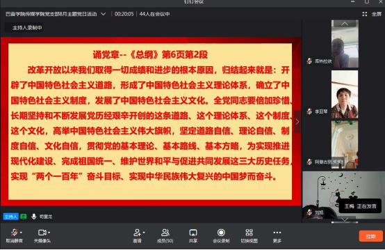 活动共有十一项议程。活动在庄严肃穆的国歌声中拉开了序幕,党员同志们重温了入党誓词,学院党委委员、副院长、传媒学院党支部书记王红同志带领全体党员和教职工共同诵读党章,传达学习《坚定决心意志 埋头苦干实干 确保如期实现建军一百年奋斗目标》。