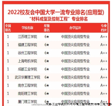 目前全国共有1270所本科院校,其中有236所高校开设材料成型及控制工程本科专业。在校友会2022中国大学一流材料成型及控制工程专业排名(研究型)中,燕山大学、山东大学、天津大学、河南科技大学、太原理工大学、华中科技大学、东北大学最具综合竞争力,夺得2022校友会中国大学材料成型及控制工程专业排名(研究型)榜首。在最新校友会2022中国大学材料成型及控制工程专业排名(应用型)中,重庆科技学院、徐州工程学院、江苏理工学院、南阳理工学院、成都工业学院、上海电机学院、湖南工程学院、厦门理工学院等综合实力最强,办学水平最高,最具竞争力,稳居2022校友会中国大学材料成型及控制工程专业排名(应用型)首位。其中,我校材控专业星级排名为“6★”,专业档次为“A++”。