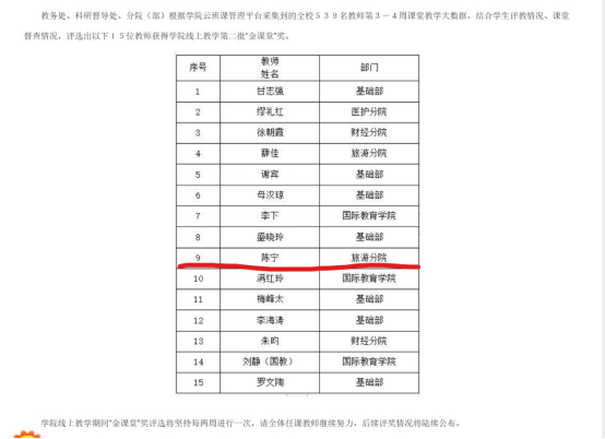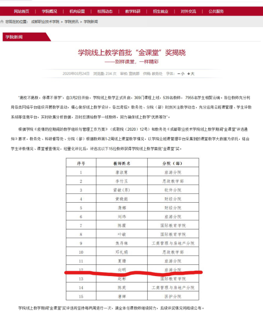 在本学期学校“停课不停学”线上教学活动中,景区专业教研室向明、陈宁、吴雪、王瑞珏等4位专任教师均获得学校线上教学“金课堂”奖。