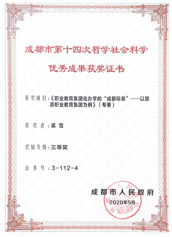 景区专业党小组守初心,担使命,践行立德树人根本任务,积极研究职业教育,服务人才培养质量的稳步提升。党小组赖斌、吴雪同志专著《职业教育集团化办学的“成都标准”——以旅游职业教育集团为例》获得成都市第十四次哲学社会科学优秀成果奖,党小组向明老师公开发表论文《乡村振兴战略背景下高职教育服务乡村旅游的路径构建》。