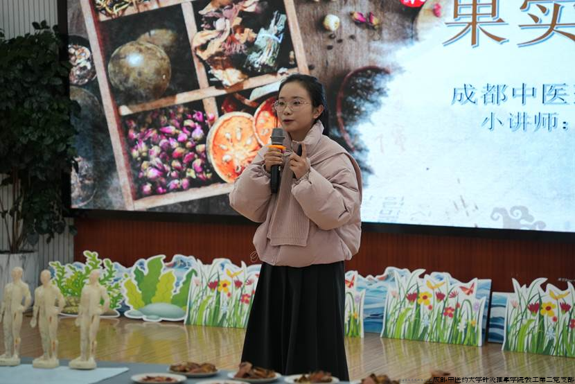 针灸推拿学2024级的李雨洁同学带来了《果实里的中药》的主题分享。她结合日常生活中的常见果实,如山楂、石榴等,深入浅出地讲解了这些果实中的药用价值,让师生们对身边的中药有了更加直观的认识。李雨洁同学以实物呈现、互动问答等方式,通过“嗅香识药”等趣味游戏环节,学生们更是亲身感受到了中药的神奇魅力,激发了学生们对中药的兴趣,让他们感受到了大自然的馈赠和中医药文化的独特魅力。