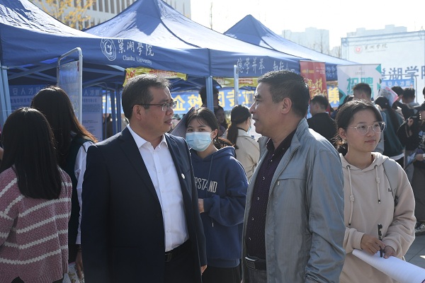 11月7日,由巢湖学院主办、安巢经开区人社局和巢湖市人社局协办、新安人才网承办的“巢湖学院2021届毕业生秋季校园双选会”在图书馆喷泉广场顺利举办。双选会吸引中铁四局、华润置地、中粮粮油、京东、苏宁等160多家用人单位到场招贤纳才。校党委副书记阮爱民,副校长黄志圣、朱定秀等来到现场指导工作。省大中专毕业生就业指导中心、安巢经开区人社局、巢湖市人社局相关同志,各学院党委书记、副书记,毕业班辅导员等到场指导学生求职应聘。