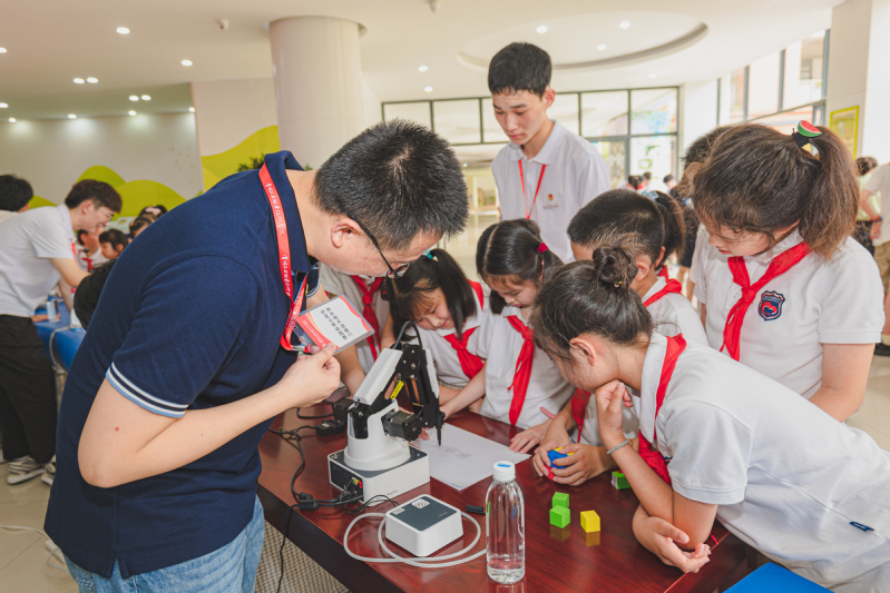 三旗接力,智造强国。智能控制学院的师生联手为现场的同学们带去了精彩的无人机和机器人科技秀。“哇,是无人机!它居然会在天上翻跟斗!”“这个机器人跳舞真厉害啊!”……亲眼目睹无人机穿越障碍、花式飞行,机器人左右摇摆、全场热舞,现场小学生们的欢呼声和掌声络绎不绝,将本次活动的气氛推向了高潮。科技秀结束后,智能控制学院的专业老师和工匠团支部的学生们带着小朋友们一起操控无人机、机械臂、机器人等科技设备,开展职业启蒙和研学体验。小学生们近距离感受到科技的魅力,点亮科技梦想,对未来的职业发展充满希望。