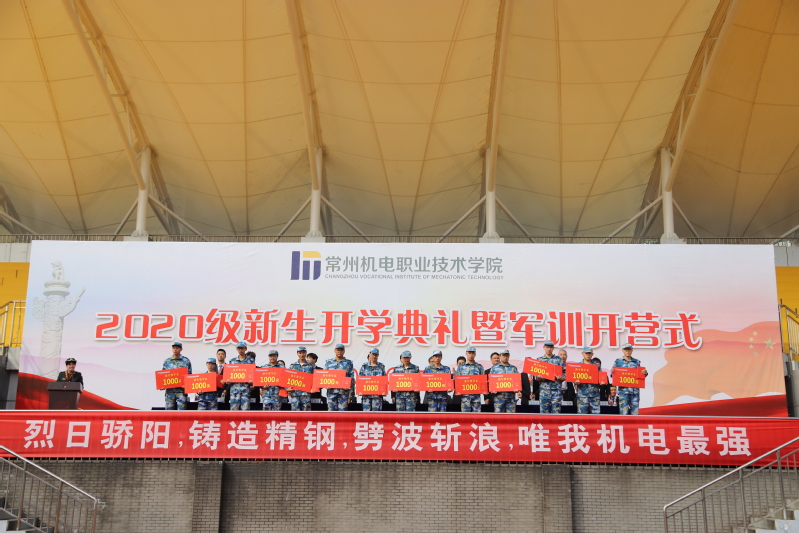 校党委副书记、校长沈琳为军训团授旗。2020级新生的常机电军训正式开营。