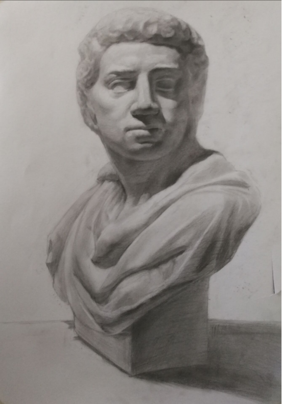 通过学习一个月的形态素描课程,让我对素描有了更深一层的了解,想要画好石膏像,就要明白练习石膏像的目的和它与静物素描和人物素描的区别。想要完成一副相对完整的石膏像素描作品,首先要构图严谨,注意空间布局和完整性,其次,造型要准确,体量要充分,位置明确,每一个转折都要细心对待,最后就要深入刻画,做到尽精微而致广大。石膏像最重要的是表现得当,在石膏像的写生中,要对它的生态、动势、气质和艺术处理进行深入的观察和感受,选用合理的构图与表现方式,对所捕捉到的审美信息做出表达。