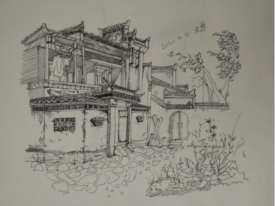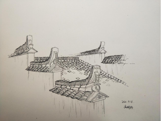 原本计划的宏村写生因为疫情而改为了网上授课。通过老师的教学让我们对徽派建筑有了初步的了解,加强了我们对于速写技法的练习。