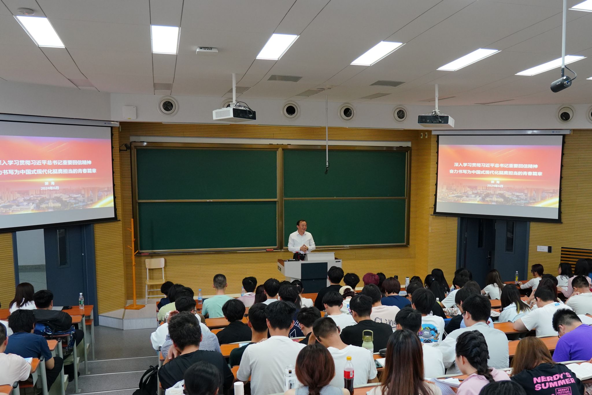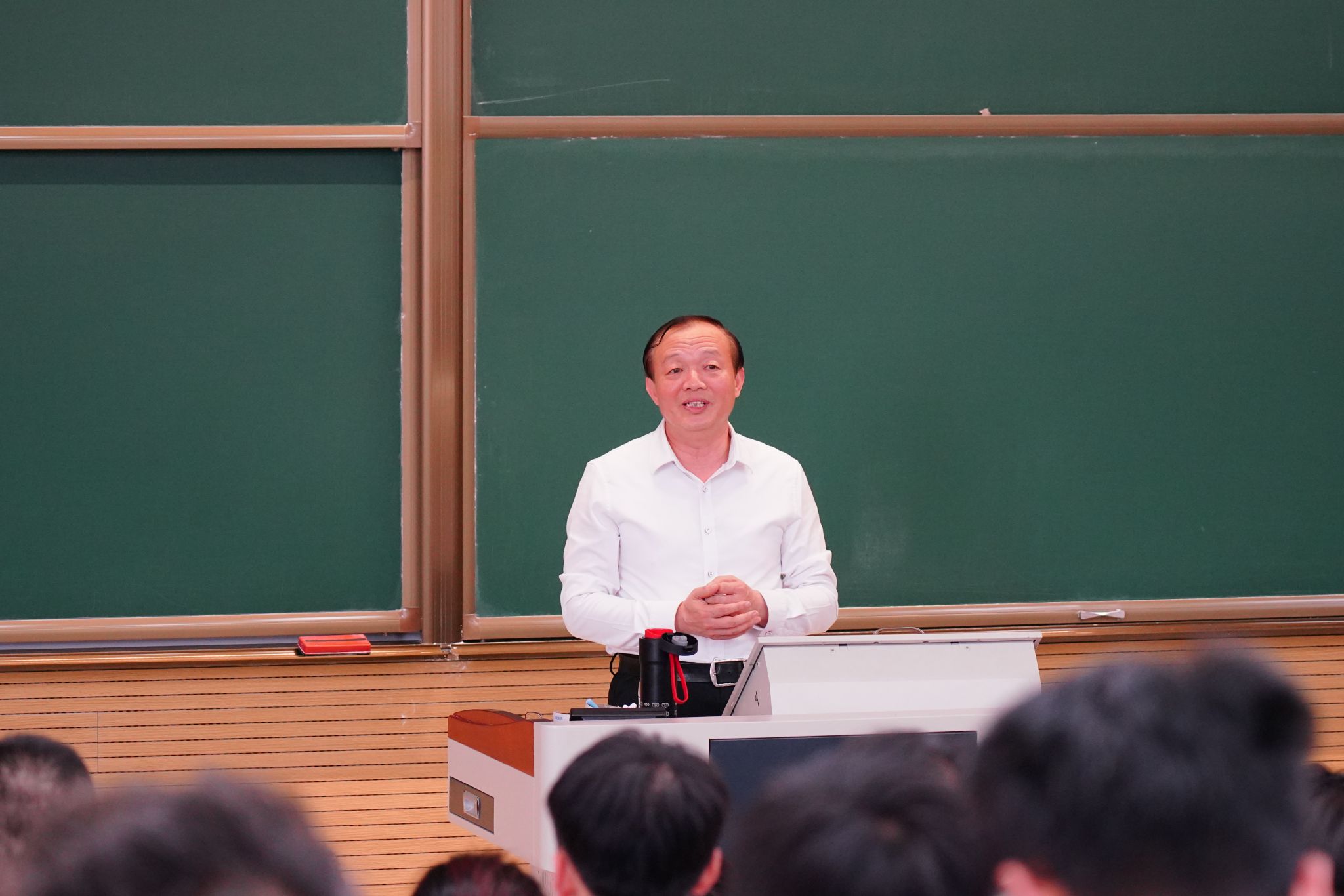 6月20日下午,东北大学党委书记郭海在浑南校区1号教学楼A307室为机器人科学与工程学院、生命科学与健康学院2023级本科生讲授专题思政课。