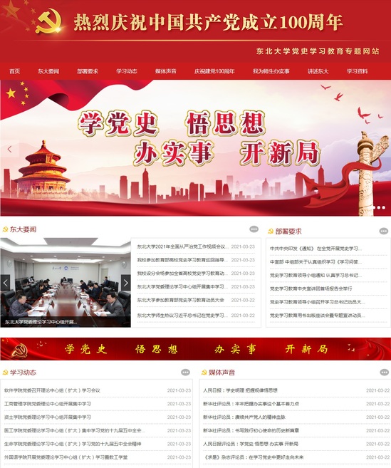 为庆祝中国共产党成立100周年,引导广大师生学史明理、学史增信、学史崇德、学史力行,3月26日,东北大学党史学习教育专题网站正式上线。党史学习教育专题网站是我校学习贯彻习近平总书记在党史学习教育动员大会上的重要讲话精神,贯彻落实党中央、教育部党组、省委教育工委有关部署安排,宣传学校党史学习教育进展情况、典型经验和学习成效的展示平台。
