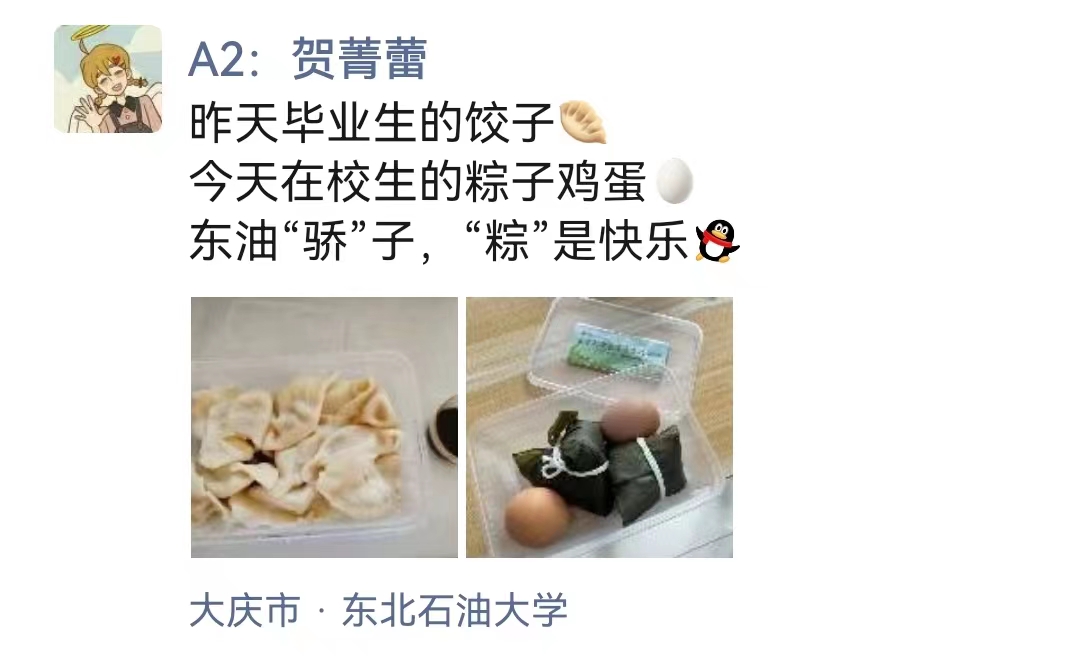 香甜的粽子、喷香的鸡蛋、美味的饺子,让同学们在收获惊喜、大饱口福的同时,更加增添了对东油的一份爱与不舍。 “饺子是真的香,天下没有不散的宴席,虽然心中万分不舍,但还是有说再见的时候,真心的感谢遇见大家、遇见电气、遇见东油。”网名“琉璃酱”、来自电气院的毕业生同学在社交媒体中写道。“你可以永远相信‘东油饺子’!爱了!”“真心被甜到了!祝东油和我们端午安康......”“为学校的这一波操作比个心......”食堂中、宿舍里、校园内........同学们纷纷晒出朋友圈、写下心里话。