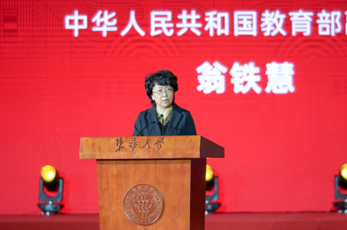 翁铁慧在大会上讲话。她代表教育部向东华大学全体师生员工和海内外校友致以诚挚的问候。她指出,自建校以来,东华大学在党的领导下,始终与党和国家事业发展同心同向同行,为新中国高等教育事业和社会主义现代化建设,为新中国纺织工业的发展壮大和人民生活水平的改善提高作出了历史性贡献。作为承担“双一流”建设重任的高校,希望东华大学以建校70周年为新起点,擦亮底色,牢牢把握社会主义的办学方向,进一步弘扬光荣传统,赓续红色血脉,牢记为党育人、为国育才的初心使命;坚守本色,全面落实立德树人根本任务,把立德树人内化到学校治理的各领域各方面各环节,坚持用习近平新时代中国特色社会主义思想铸魂育人、启智润心;彰显特色,积极服务国家重大战略需求,更加自觉地把学校改革发展放到党和国家发展大局中去谋划和推动,不断增强服务国家战略和经济社会发展的特色优势和战略定力,在建设教育强国、人才强国、科技强国、制造强国和文化强国的伟大征程上,以富有特色的突出业绩和贡献,织就绚丽多彩的华美画卷。