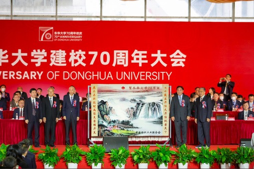 大会还举行了赠送仪式,杜钰洲、许坤元、王天凯、林乃基代表中国纺织工业联合会向东华大学赠送题有“七十载东华纺大华纺桃李天下,展未来科技时尚绿色荣耀华夏”的挂毯,以表达校庆祝贺。