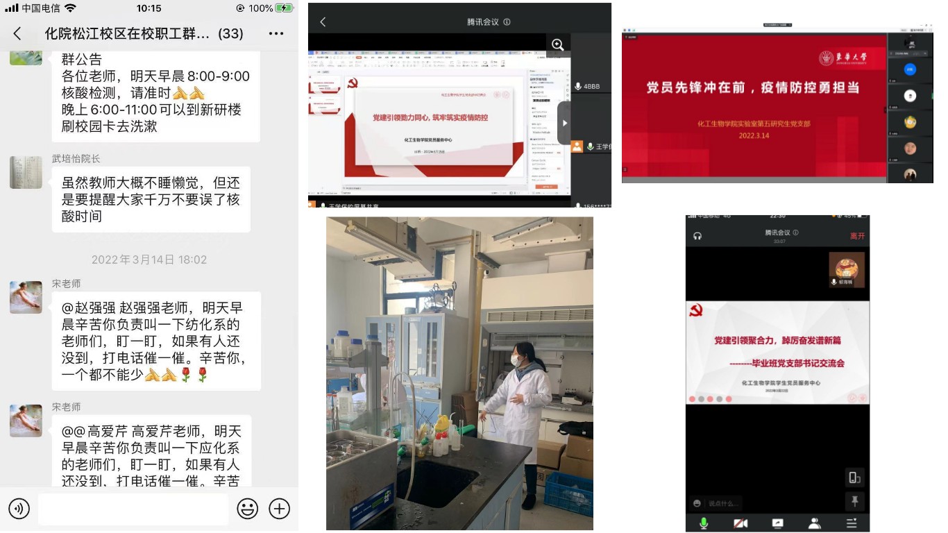 如何确保停课不停教、防疫不妨学,这是学院共同聚焦高度重视的问题。师生线上面对面,互动课堂“云端见”,学院快速启动网络教学,全体老师第一时间全身心投入线上教学,精心打磨教学内容,教学科研有序开展。学院党政班子始终心系在校师生的生活问题,千方百计筹措物资,为在校老师送去床垫棉被、食品、换洗衣物等,提供坚强保障;多位导师克服家人生病、家中无人照料等重重困难,坚守一线,悉心指导学生实验工作和论文撰写,鼓励学生坚定抗疫必胜信心;多名教师自封校以来连续多天核酸检测,学校一转入准封闭状态立即申请进校,立刻以饱满精神状态推进教学与科研工作,提前准备好研究生复试工作。纺织化学与染整工程学科党支部教师党员主动承担值班工作,由“面对面”改为“键对键”对学生有效开展实验安全培训、学业关怀和心理疏导,用“辛苦指数”换来学生成长的“幸福指数”。学业支持发展中心创建“花生仁学业互助”交流群,鼓励带动学生每日打卡学习,分享学习笔记,营造浓厚的线上学习氛围;从入党积极分子中精心挑选的学业小讲师们积极录制学业微课,凝练总结高数学习方法,微课视频被学校学生事务中心公众号转载,辐射全校学生。