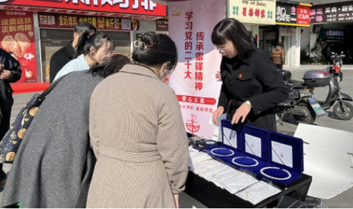 主题党日以2023年“织爱助学金”义卖活动拉开序幕,“织爱助学金”是学生就业服务中心党支部连续十一年设立的助学金,每年三月通过义卖助学的形式表达对雷锋精神的敬意,提醒支部每位党员人民至上、心怀大爱、锐意进取,以“向上”“向善”为价值追求,努力工作、积极生活。两个支部的党员以学习党的二十大为契机,共同践行雷锋精神,在春日的文汇路,为织爱助学金再添温暖。