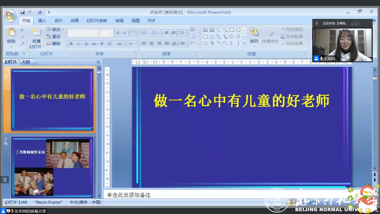 11月29日,党委学生工作部在线举办“四有”好老师大讲堂活动,全国人大代表、北京市政协委员、全国模范教师、北京市优秀教师、北京教科院基础教育研究中心数学特级教师吴正宪,做客本次“四有”好老师大讲堂,并作题为“做心中有儿童的好老师”主题报告,北京校区和珠海校区共600余名师范生参加了讲座。