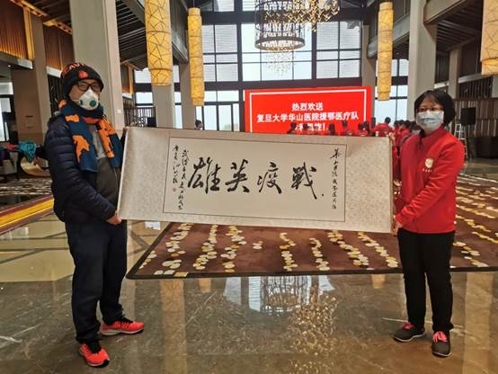 复旦大学武汉校友会名誉会长江作苏代表校友会题“战疫英雄”赠华山医院援鄂医疗队。图中为复旦大学武汉校友会秘书长王栎栎和华山医院援鄂四纵队张静护士长