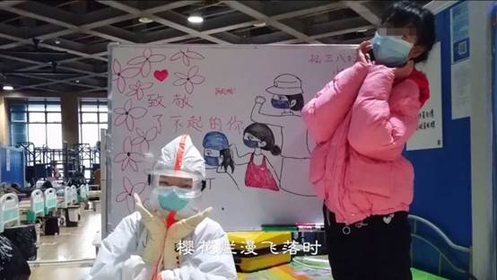 武昌方舱医院里十岁的患者小女孩非常喜欢画画,画了很多画挂在墙上,充满童真。有一天,这个喜欢粉色、喜欢一切草莓味的小女孩说特别想要一块画板,华山医院支援武汉国家紧急医学救援队(华山三纵队)护士长卫尹通过多方协调,当天下午就给小女孩送来了一块大画板。小女孩对医生、护士说自己有点不想离开这里,因为这里的医生护士都太好了。对于女孩来说,方舱也是成长中一次特别的经历。