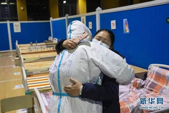 3月9日晚,在武汉市洪山体育馆武昌方舱医院,当晚还留在该方舱的新冠肺炎患者应女士与复旦大学附属华山医院医务人员曹晶磊拥抱道别