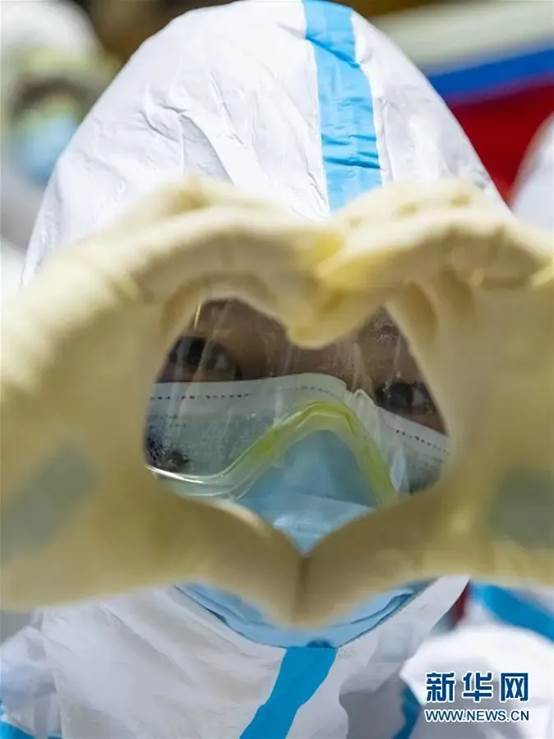 3月9日晚,在武汉市洪山体育馆武昌方舱医院,复旦大学附属华山医院医务人员韩杨用双手比出心形