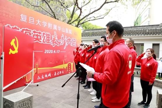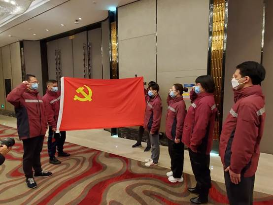 3月6日,在华山医院第三批支援武汉医疗队临时党支部书记马昕的见证下,李丽、朱禛菁、高鹏、曹晶磊4位队员在党旗下庄严宣誓