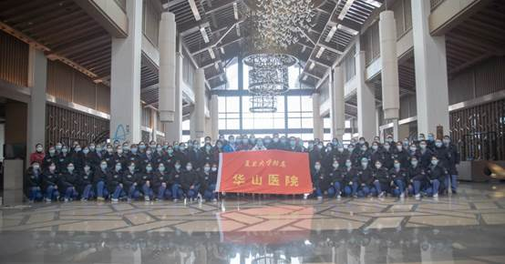 2月8日,元宵之夜,华山医院再接国家紧急征召令——整建制接管华中科技大学同济医学院附属同济医院光谷院区重症ICU。一个不眠之夜后,华山医院第四批支援武汉医疗队215人的队伍整装待发。明知此役艰险,充满风险,华山人依然毫不犹豫,奋不顾身。图为出征前,医疗队队员与赶来送行的领导组成HS(“华山”)字样合影。